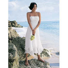 Classic Empire Waist Spaghetti Straps Tea Length Embroidery Ivory Chiffon Beach Wedding Dress