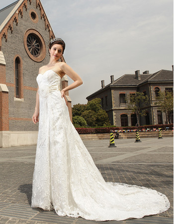 • Discount Chic Modern Lace Sweep Train Sweetheart A-Line Wedding Dress