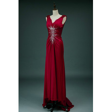 Sexy Sheath V-Neck Sweep Train Satin Beading Formal Evening Dress